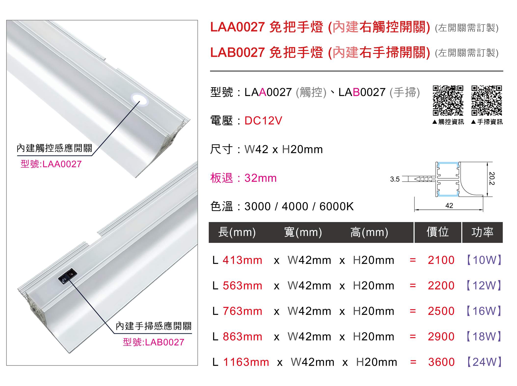 首頁/所有商品/免把手燈系列/外接變壓器/LAB0027 免把手燈 #手掃|免把手燈 LAB0027 免把手燈 #手掃|免把手燈NT$2,100 – NT$3,600價格範圍:NT$2,100 到 NT$3,600 型號 : LAB0027 電壓 : DC12V(需變壓器) 尺寸 : W42 x H20mm 板退 : 32mm 色溫 : 3000 / 4000 / 6000K 備註: 。請特別注意【板退尺寸距離】。 尺寸 請選取一個選項413mm563mm763mm863mm1163mm 色溫 請選取一個選項3000K4000K6000K 開關 請選取一個選項右手掃清除 LAB0027 免把手燈 #手掃|免把手燈 數量 加入購物車 貨號: LAB0027 分類: 廚房, 所有商品, 外接變壓器, 免把手燈系列 描述 商品評價 目前沒有評價。 只有註冊並且購買過商品的顧客才能撰寫評價。 相關商品 LAB0026 免把手燈 #手掃|免把手燈 NT$2,100 – NT$3,600價格範圍:NT$2,100 到 NT$3,600 選擇規格 此產品有多種款式。 可在產品頁面選擇選項 全電壓內建開關免把手燈 #手掃|免把手燈 NT$2,700 – NT$4,200價格範圍:NT$2,700 到 NT$4,200 選擇規格 此產品有多種款式。 可在產品頁面選擇選項 LAA0027 免把手燈 #觸控|免把手燈 NT$2,100 – NT$3,600價格範圍:NT$2,100 到 NT$3,600 選擇規格 此產品有多種款式。 可在產品頁面選擇選項 全電壓內建開關免把手燈 #觸控|免把手燈 NT$2,700 – NT$4,200價格範圍:NT$2,700 到 NT$4,200 選擇規格 此產品有多種款式。 可在產品頁面選擇選項 全電壓內建開關免把手燈 #無開關|免把手燈 NT$1,900 – NT$3,000價格範圍:NT$1,900 到 NT$3,000 選擇規格 此產品有多種款式。 可在產品頁面選擇選項 全電壓內建開關免把手上下照明燈 #無開關|免把手燈 NT$1,900 – NT$3,000價格範圍:NT$1,900 到 NT$3,000 選擇規格 此產品有多種款式。 可在產品頁面選擇選項 全電壓內建開關免把手上下照明燈 #觸控|免把手燈 NT$2,700 – NT$4,200價格範圍:NT$2,700 到 NT$4,200 選擇規格 此產品有多種款式。 可在產品頁面選擇選項 全電壓內建開關免把手上下照明燈 #手掃|免把手燈 NT$2,700 – NT$4,200價格範圍:NT$2,700 到 NT$4,200 選擇規格 此產品有多種款式。 可在產品頁面選擇選項 LAA0026 免把手燈 #觸控|免把手燈 NT$2,100 – NT$3,600價格範圍:NT$2,100 到 NT$3,600 選擇規格 此產品有多種款式。 可在產品頁面選擇選項