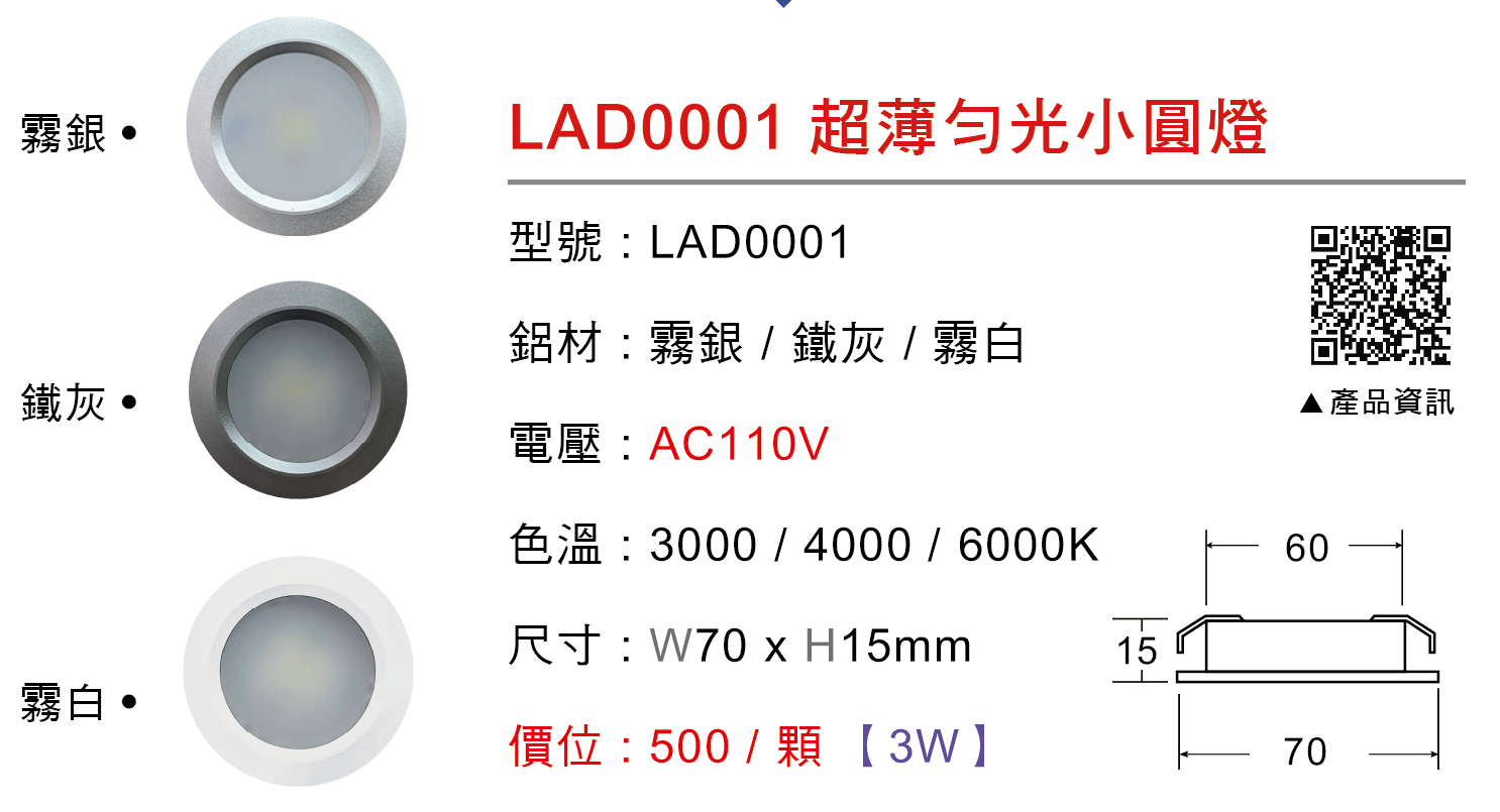 首頁/所有商品/崁燈系列/小圓燈/超薄勻光小圓燈|筒燈 超薄勻光小圓燈|筒燈NT$500 型號:LAD0001 鋁材:霧銀 / 鐵灰 / 霧白 電壓:AC110V 色溫:3000 / 4000 / 6000K 尺寸:W70 x H 15mm 功率:3W 鋁材 請選取一個選項霧銀鐵灰霧白 色溫 請選取一個選項3000K4000K6000K清除 超薄勻光小圓燈|筒燈 數量 加入購物車 貨號: LAD0001 分類: 所有商品, 小圓燈, 崁燈系列 描述 商品評價 目前沒有評價。 只有註冊並且購買過商品的顧客才能撰寫評價。 相關商品 斜面小圓燈|筒燈 NT$600 選擇規格 此產品有多種款式。 可在產品頁面選擇選項 直裝小圓燈 – 45mm|筒燈 NT$600 選擇規格 此產品有多種款式。 可在產品頁面選擇選項 直裝小圓燈 – 80mm|筒燈 NT$800 選擇規格 此產品有多種款式。 可在產品頁面選擇選項