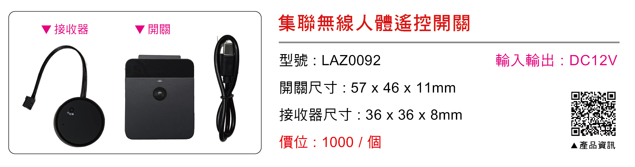 首頁/所有商品/開關系列/【集聯】開關/集聯無線人體遙控開關|集聯 集聯無線人體遙控開關|集聯NT$1,000 型號 : LAZ0092 輸入電壓 : DC12-24V 輸出電壓 : DC12-24V 開關尺寸 : 57 x 46 x 11mm 接收器尺寸 : 36 x 36 x 8mm 備註 : 。此商品需搭配 集聯變壓器 使用 集聯無線人體遙控開關|集聯 數量 加入購物車 貨號: LAZ0092 分類: 臥室, 玄關/走道, 所有商品, 【集聯】開關, 開關系列 描述 商品評價 目前沒有評價。 只有註冊並且購買過商品的顧客才能撰寫評價。 相關商品 星銳_集聯觸控感應開關 #12|集聯 NT$360 – NT$1,620價格範圍:NT$360 到 NT$1,620 選擇規格 此產品有多種款式。 可在產品頁面選擇選項 集聯隔山打牛觸控感應開關|集聯 NT$400 加入購物車 集聯無線觸控遙控開關|集聯 NT$1,000 加入購物車 集聯無線雙門遙控開關|集聯 NT$1,000 加入購物車 集聯無線單門手掃遙控開關|集聯 NT$1,000 加入購物車 星銳_集聯觸控感應開關 #17|集聯 NT$360 – NT$1,620價格範圍:NT$360 到 NT$1,620 選擇規格 此產品有多種款式。 可在產品頁面選擇選項 星銳_集聯手掃感應開關|集聯 NT$360 – NT$1,620價格範圍:NT$360 到 NT$1,620 選擇規格 此產品有多種款式。 可在產品頁面選擇選項 星銳_集聯人體感應開關|集聯 NT$360 – NT$1,620價格範圍:NT$360 到 NT$1,620 選擇規格 此產品有多種款式。 可在產品頁面選擇選項 星銳_集聯門控感應開關|集聯 NT$360 – NT$1,620價格範圍:NT$360 到 NT$1,620 選擇規格 此產品有多種款式。 可在產品頁面選擇選項 星銳_集聯雙門控感應開關|集聯 NT$360 – NT$1,720價格範圍:NT$360 到 NT$1,720 選擇規格 此產品有多種款式。 可在產品頁面選擇選項 集聯線組|集聯 NT$200 加入購物車